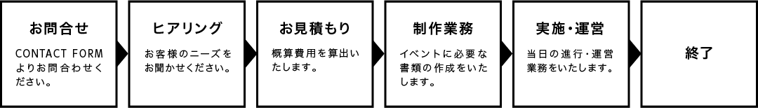 イベント運営20年以上の実績から築き上げてきたノウハウと幅広い人脈で、どんなご要望にも臨機応変に対応させていただくため、長いおつきあいのお客様は多数。お客様との出会いを大切に、ご期待と信頼に向かい合いながらイベントをカタチづくり、育んでいきます。